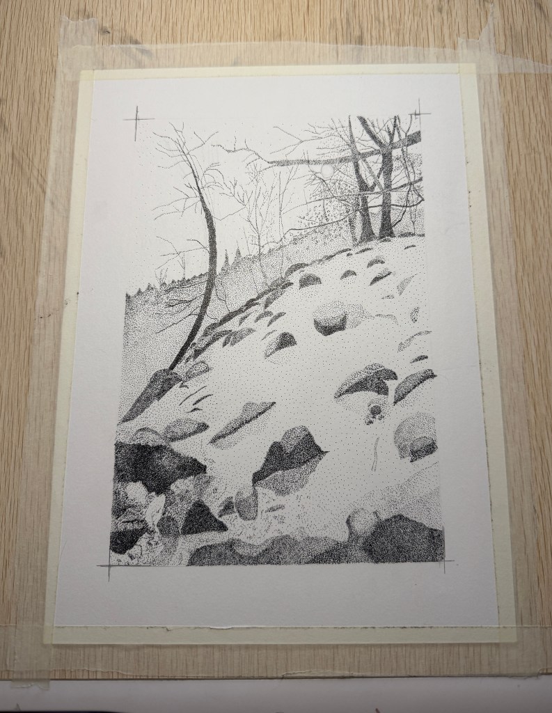 I went for a walk up Rodneys Pillar, I drove there!! And on the way down spotted multiple moss hills casting shadows across the verge from the beating sun. I wanted to capture them not only by photograph, but in ink.