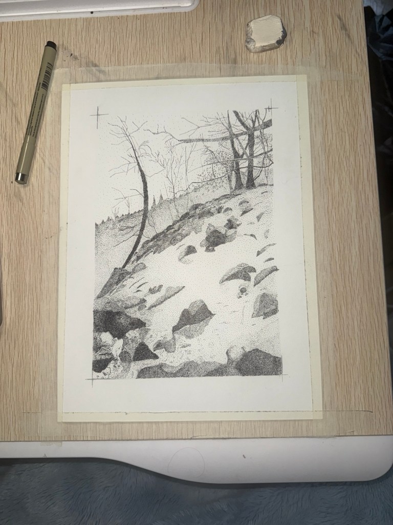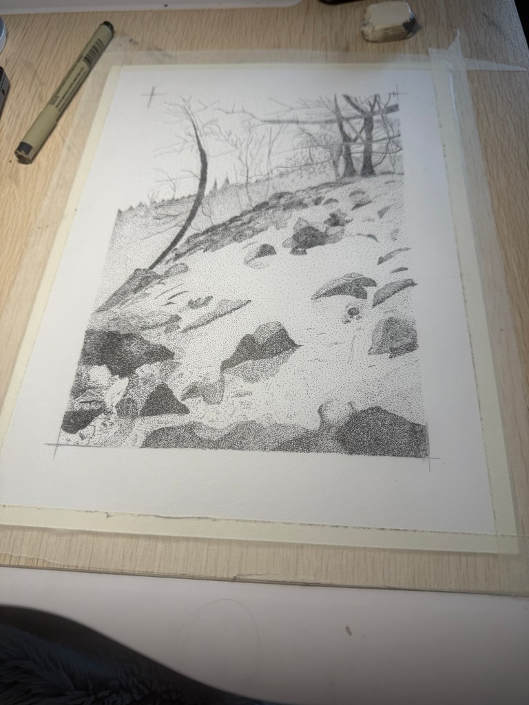 I’ve noticed my mood changing how each dot and each area comes out. The lower my mood the more likely it is for things to become too dark or concentrated. There’s an area on the image that I did yesterday after a difficult phonecall and I can’t stop staring at it. It stands out somehow. Only when the entire piece is finished will I know if it actually stands out or if it just has emotional meaning to me.