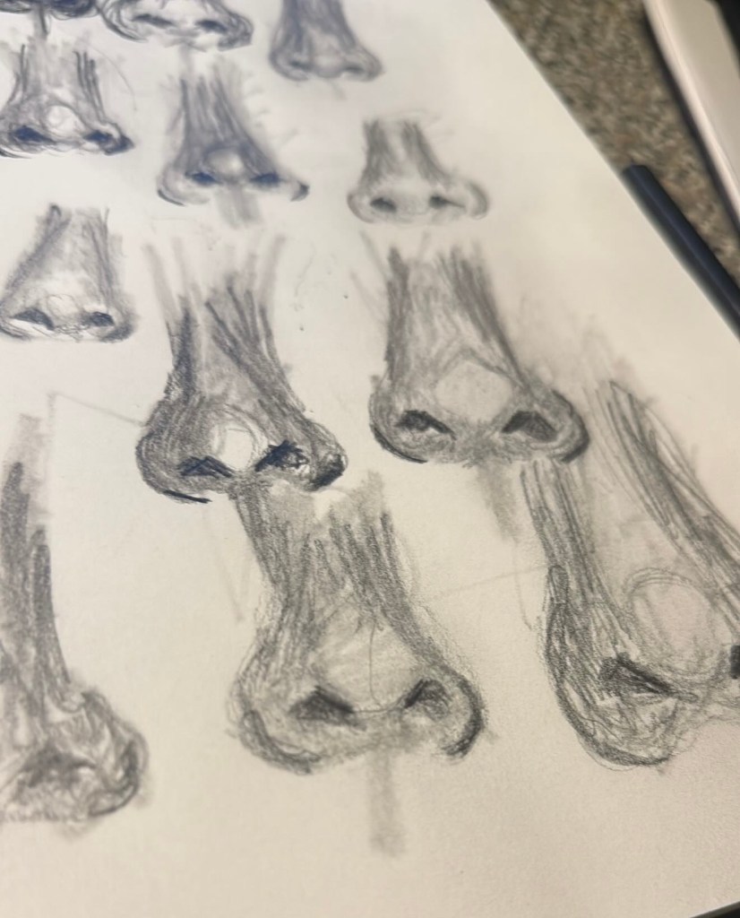 Continuing with my drawing practice I did quick sketches of noses, to see if I could even remember them. I do and I’m realising the amount I need to practice light source and values. My eye isn’t adjusted and it’s all over the shop. Still happy with them.