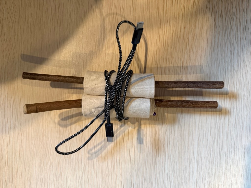 I’m unsure whether I’m going to tie it with cable or use string. The other option is to get a usb c cable and take off the protective plastic, that way it would tie a lot easier