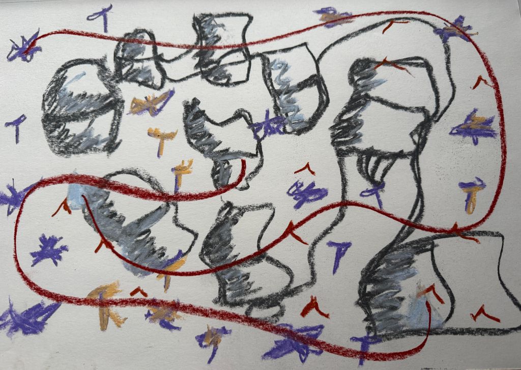 After looking at those photos I sat and drew in soft pastels. A mix of ostomy, feeding tube and scars. All mangled together. Because thats how my brain feels right now, after witnessing my past through pictures. I want to continue to draw these. I feel far enough away from it all to face it properly. I’m also going to go scavenging for more videos and photos of these times, the debris that remains after deletion.